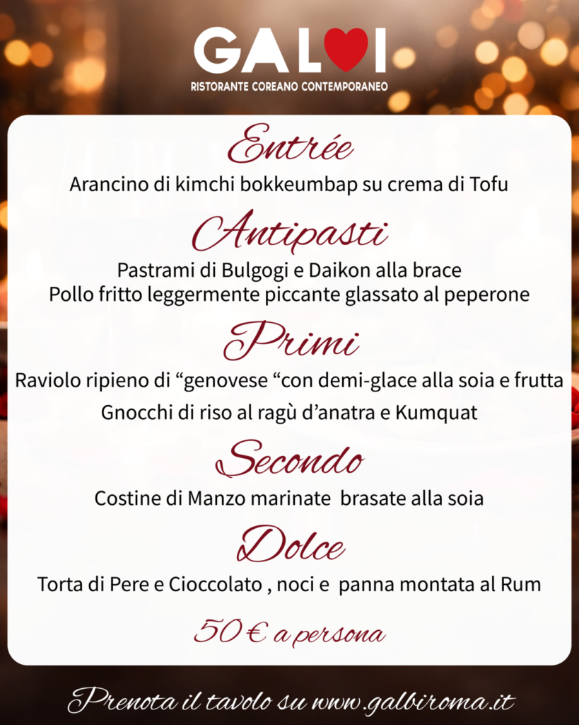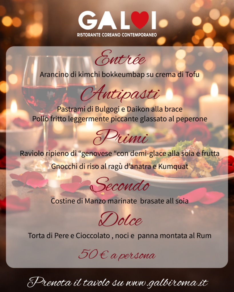 Festeggia San Valentino da Galbi, ristorante coreano contemporaneo a Roma, con una cena speciale pensata per chi vuole vivere una serata romantica diversa dal solito. Per l’occasione proponiamo un menù dedicato con un percorso completo dall’entrée al dolce, tra sapori autentici e abbinamenti sorprendenti.